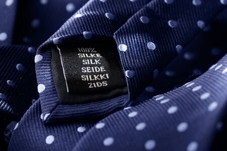Label of a tie made of silk. Short depth of field, the sharpness is in the word Silk.