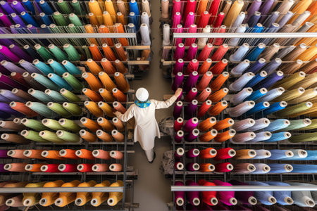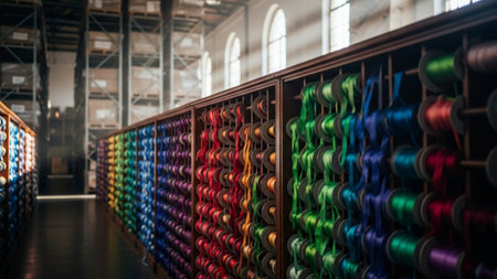 A vibrant textile factory scene showcasing organized spools of colorful threads in a well-equipped workspace. The industrial machinery reflects creativity in fabric production.