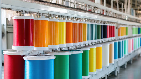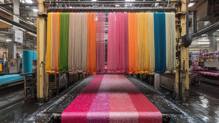 A modern textile factory showcases vibrant rainbow threads emerging from advanced machinery, capturing the essence of industrial production and artistic creativity in textiles.