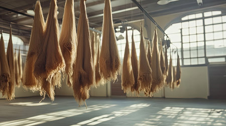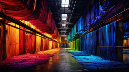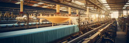 Explore the captivating process of textile manufacturing in an industrial setting, featuring an array of machinery, vibrant fabrics, and a nostalgic atmosphere.