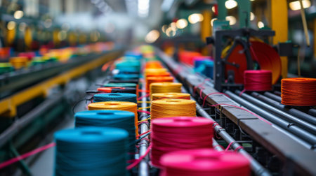 A dynamic scene showcases vibrant threads in motion along a production line in a textile factory, highlighting the colorful spools of fabric and machinery.