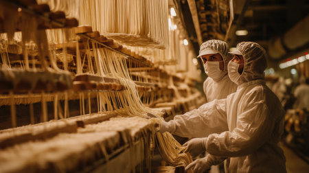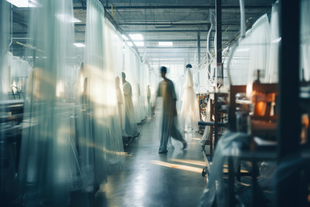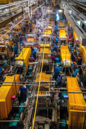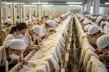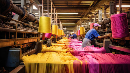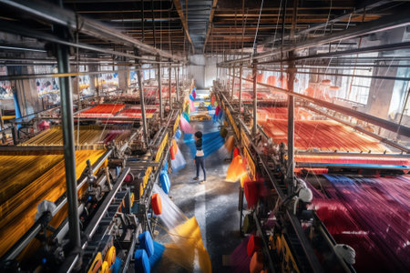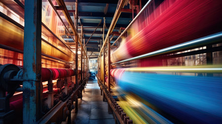 textile factory, with rows of machines and workers producing fabric in a blur of motion, created with generative ai