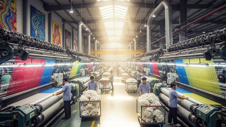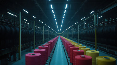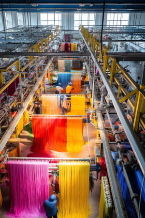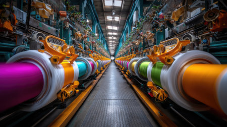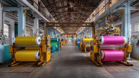 Dynamic view of a large-scale textile factory showcasing colorful fabric rollers and advanced machinery, highlighting efficient manufacturing processes and modern design.