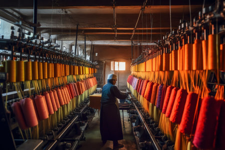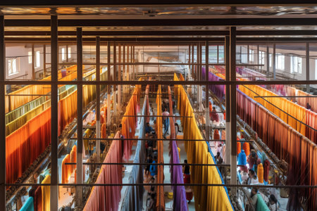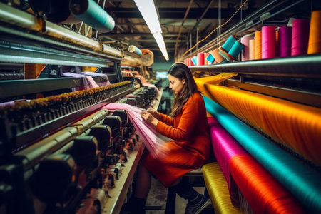 textile factory, with looms producing vibrant and colorful fabrics, created with generative ai