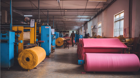 A dynamic textile manufacturing facility showcases large rolls of colorful fabric, machinery in operation, and a busy workspace, encapsulating production energy.