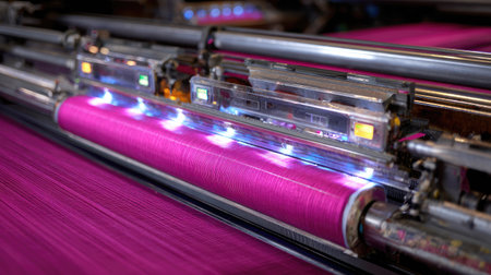 This image showcases a close-up of advanced textile machinery at work, producing vivid magenta threads. The intricate details highlight technology in fabric production.