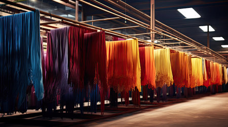 A vibrant textile manufacturing facility shows colorful fabrics hanging from above, creating an organized and efficient workspace with modern equipment.