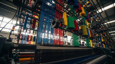 Textile manufacturing process in a busy factory with machines weaving colorful threads during daylight hours