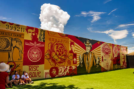 Miami, United States - July 29, 2019: Huge wall paintings adorn abandoned warehouses, stores and fences in the arts district of Wynwood Walls in Miami
