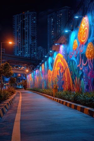 A brightly colored graffiti mural adorns a long wall alongside a road at night. The artwork features abstract shapes in vivid orange, blue, and yellow hues, enhanced by artificial lighting. The composition includes an empty road with a dividing line, suggesting a urban or artistic environment. This image is suitable for various commercial uses.