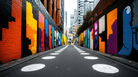 Colorful street art brings life to urban walking path during daytime in a vibrant city