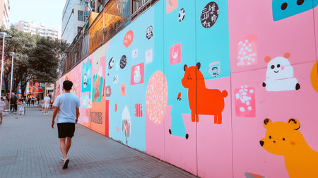 Colorful mural art brightens urban walkway during sunny afternoon stroll