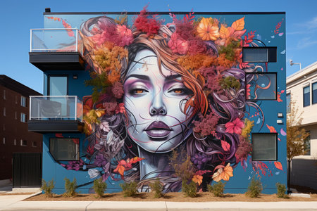 Vibrant street art portrait of a woman with bold colors and intricate details