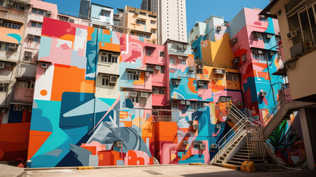 A vibrant mural showcasing geometric shapes and bold colors adorns a city wall. This artwork enhances the urban landscape, creating a lively atmosphere in daytime.