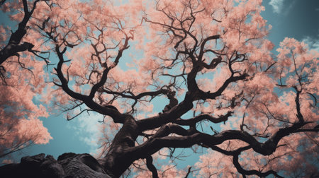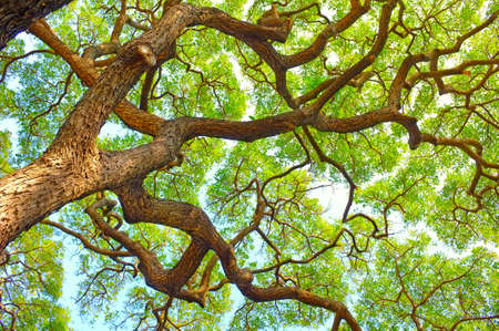 A striking perspective of a large tree captured from its base, showcasing the extensive network of branches and vibrant green leaves. The upward view reveals the tree's height against the sky, illuminated by sunlight. This image is suitable for various commercial uses, including environmental themes and nature-related content.