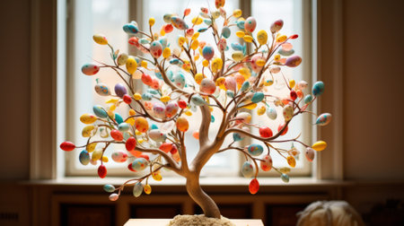 Easter egg tree with colorful painted eggs, floral style, on a wooden table by a window, concept of Easter celebration.