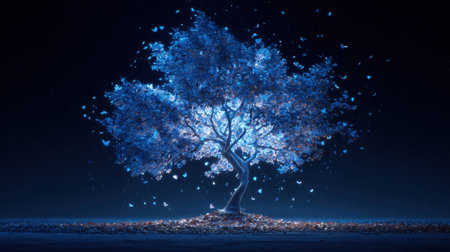 A surreal scene featuring a glowing tree surrounded by delicate blue butterflies, creating a whimsical and magical atmosphere under a night sky.