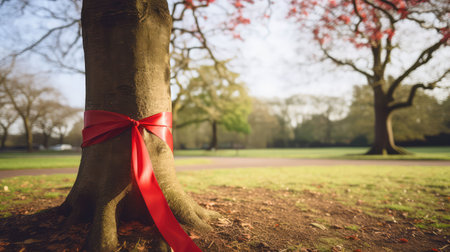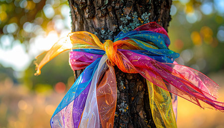 A vibrant, multi-colored ribbon is tied around the textured bark of an old tree, illuminated by the golden glow of the setting sun.