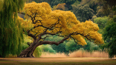 In the city park, there is an enormous green tree with hanging vines that resemble mossy branches and leaves. The background features trees of various sizes in different parts of the town. This photo was taken using a Canon EOS R5 camera. --ar 53:30 --v 6.1 Job ID: 7249258d-7e64-4336-982a-ec736156d90f