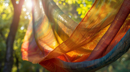 Close-up of a colorful cloth fluttering in the breeze, with blurred green trees in the background, evoking a feeling of movement and nature. --chaos
