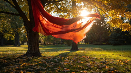 A solitary red scarf glides effortlessly through the air adding a pop of color to the tranquil park scenery