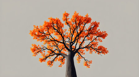An artistic rendering of an autumn tree with bright orange leaves, contrasted against a solid grey background. The tree's branches and trunk are visible. A visually striking image.