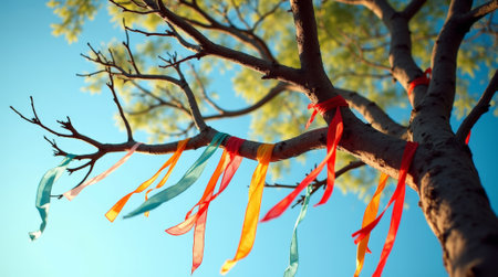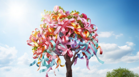 Tree with colorful ribbons against bright blue sky with clouds 3d