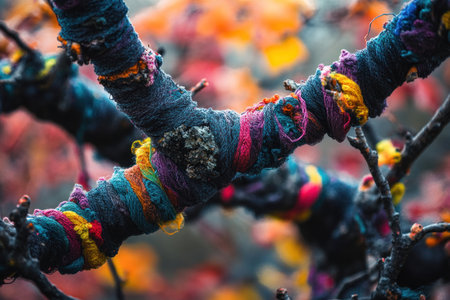 A close-up of intertwined tree branches, each one covered in colorful threads and fibers, creating an intricate tapestry that seems to intertwine with the natural world. The background is blurred, focusing on the detailed textures created by the various colored threads, producing a surreal effect. This artistic representation captures the beauty of nature's colors being seamlessly integrated into its environment. --ar 3:2 --v 6.1 Job ID: 51d2191a-b517-4ef0-9ee0-3746ea8c3da6