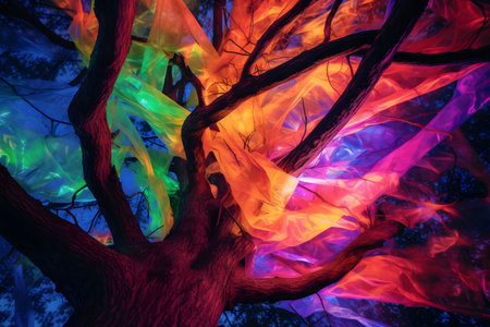 An AI generated multicolored light shines through the silhouetted branches of a tree