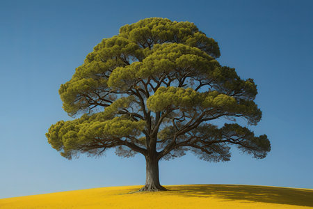 A majestic solitary tree stands proudly on a lush green hill under a vibrant blue sky, embodying tranquility and natural beauty in a serene landscape.