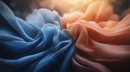 Intertwined flowing fabrics in blue and orange create a captivating visual texture, enhancing the scene with a sense of movement and soft ambiance, AI generated