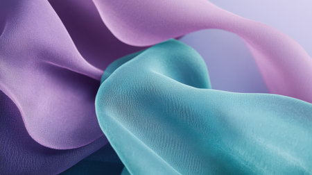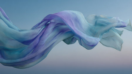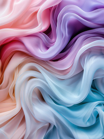 Ethereal silk fabric gracefully flows in the wind, showcasing soft pastel colors. This high-resolution image captures fine details and textures, perfect for artistic and design projects.