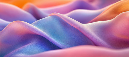 Ethereal pastel textiles cascade in gentle ripples, softly reflecting light and blending hues of pink, orange, blue, and purple into a romantic, dreamlike embrace.