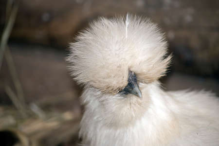 Fluffy white silkie farm chicken, looking fabulous, selective focus