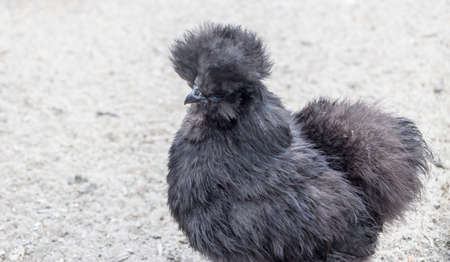 silkie chicken: gray rooster. Silkie - an unusual breed poultry with fluffy like wool feathers and black leather. Selective focus image.