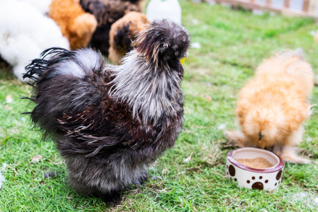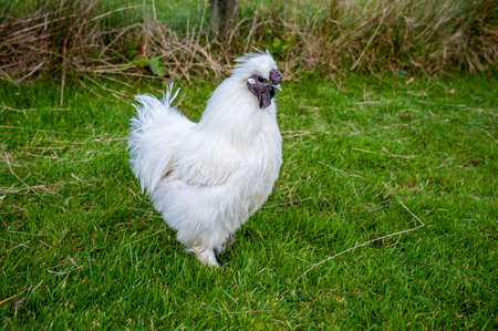 Silkie chicken in a rural garden with green grass in the spring on a sunny day