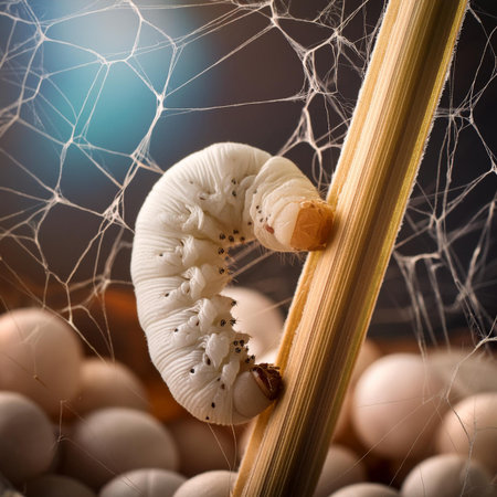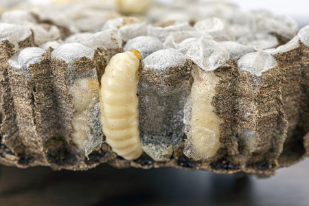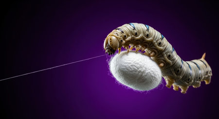 A silkworm actively spins silk to create a white cocoon, showcasing the natural process of sericulture. This close up highlights the intricate details of the insect and its valuable production.
