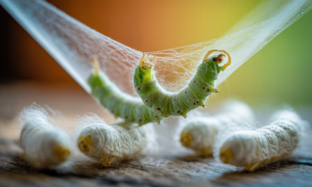 Green silkworm caterpillar actively spinning delicate silk threads, forming a protective web. several white cocoons rest on a rustic wooden surface, illustrating the sericulture process.