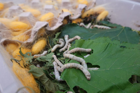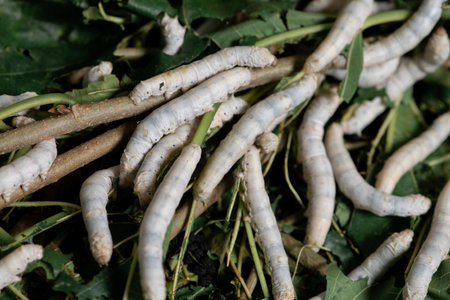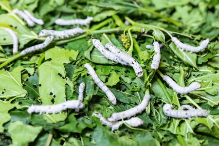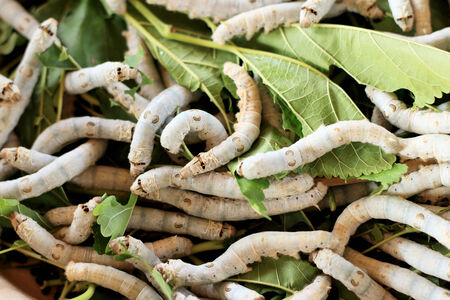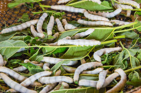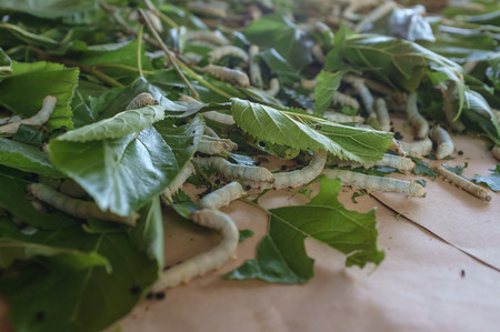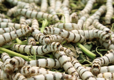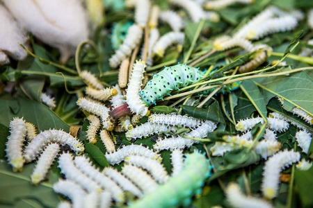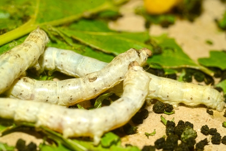 silkworm eating leaf in silk industry