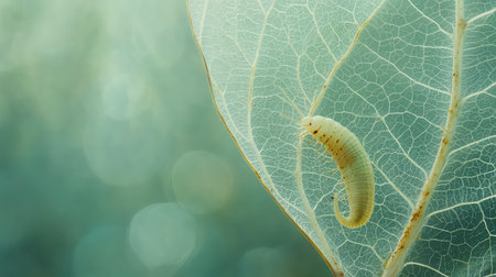 A serene close-up of a larva resting on a delicate leaf showcasing intricate leaf veins and a soft blurred background, highlighting the beauty of nature.