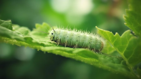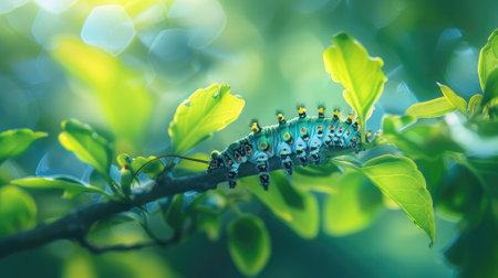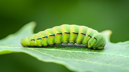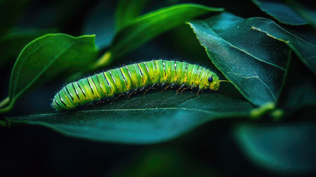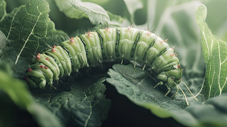 This mesmerizing close-up captures a green caterpillar resting on fresh green leaves, showcasing nature's intricate details and the beauty of transformation.