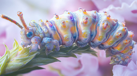 This stunning macro photograph showcases a colorful caterpillar perched on a leaf, surrounded by soft flower petals, highlighting its intricate details and vibrant colors.
