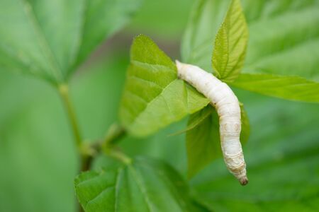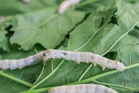 Closed up of silkworm on mulberry leaf background