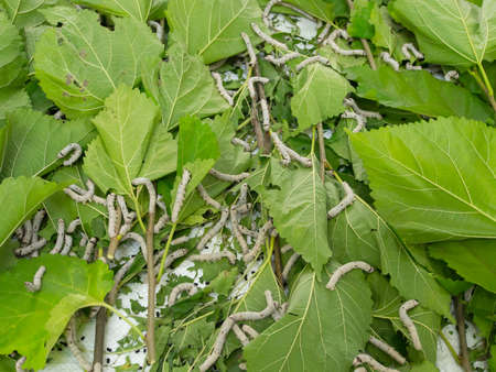 Close up view of Bombyx mori or silkworms eating mulberry green leaves, silk cocoon harvest and process.