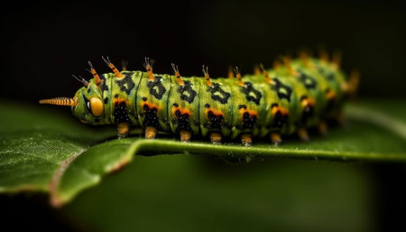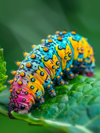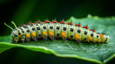 AI Generated. Colorful Caterpillar Crawling on Green Leaf in Natural Habitat