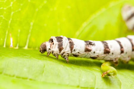 Macro photo of a Silkworm eating a mulberry leaf. room for text .