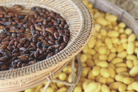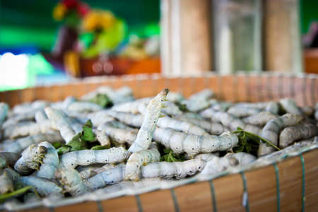 Silkworm is worm to creates a silk cocoon of yellow fibers use for weave of making Thai silk from cocoon use by homemade in Laos and Thailand