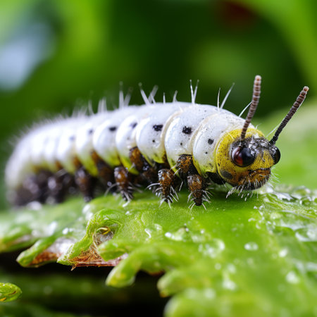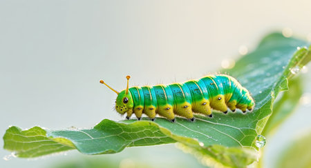 a small caterpillar crawls on a leaf, adorned with water droplets. this captivating photo captures the essence of animal intensity, reminiscent of the style of sofonisba anguissola. the image is composed in light gray and white tones, with a wide-angle lens capturing the details. the primary colors add a vibrant touch to the polished metamorphosis depicted. rtx on. ai generated