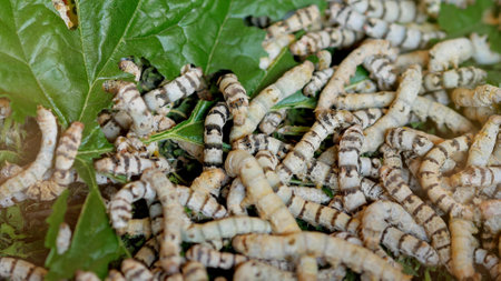 Silkworms eating mulberry leaf closeup nature silk worms.