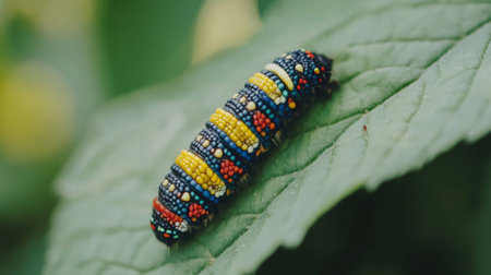 A vibrant caterpillar with striking colors rests on a lush green leaf. This close-up captures the beauty of nature and the intricate details of wildlife.